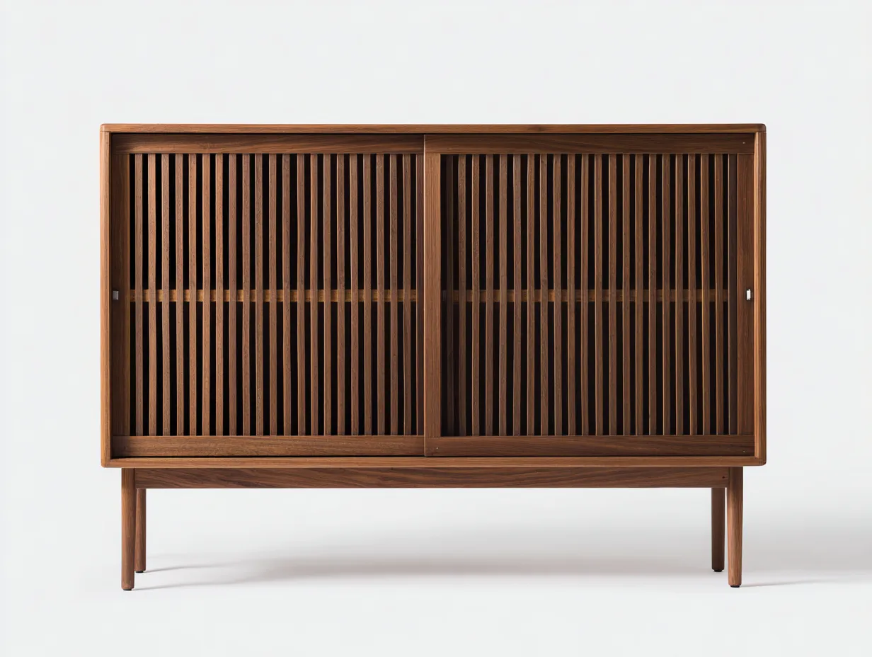 Armadio contenitore in legno 148x42x112 cm - noce caldo - ante scorrevoli a doghe - design rétro basso per soggiorno
