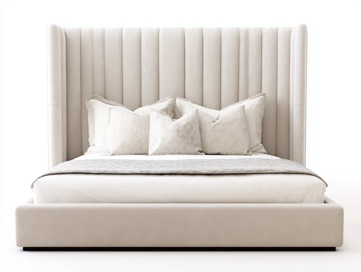 La testiera alta con ali laterali valorizza la parete e migliora il comfort durante la lettura o il relax. Le cuciture verticali aggiungono ritmo visivo senza appesantire l'insieme. Il giroletto imbottito contribuisce a un aspetto pulito e più morbido rispetto ai letti con struttura rigida a vista. Tonalità neutra facile da abbinare a biancheria e arredi diversi.